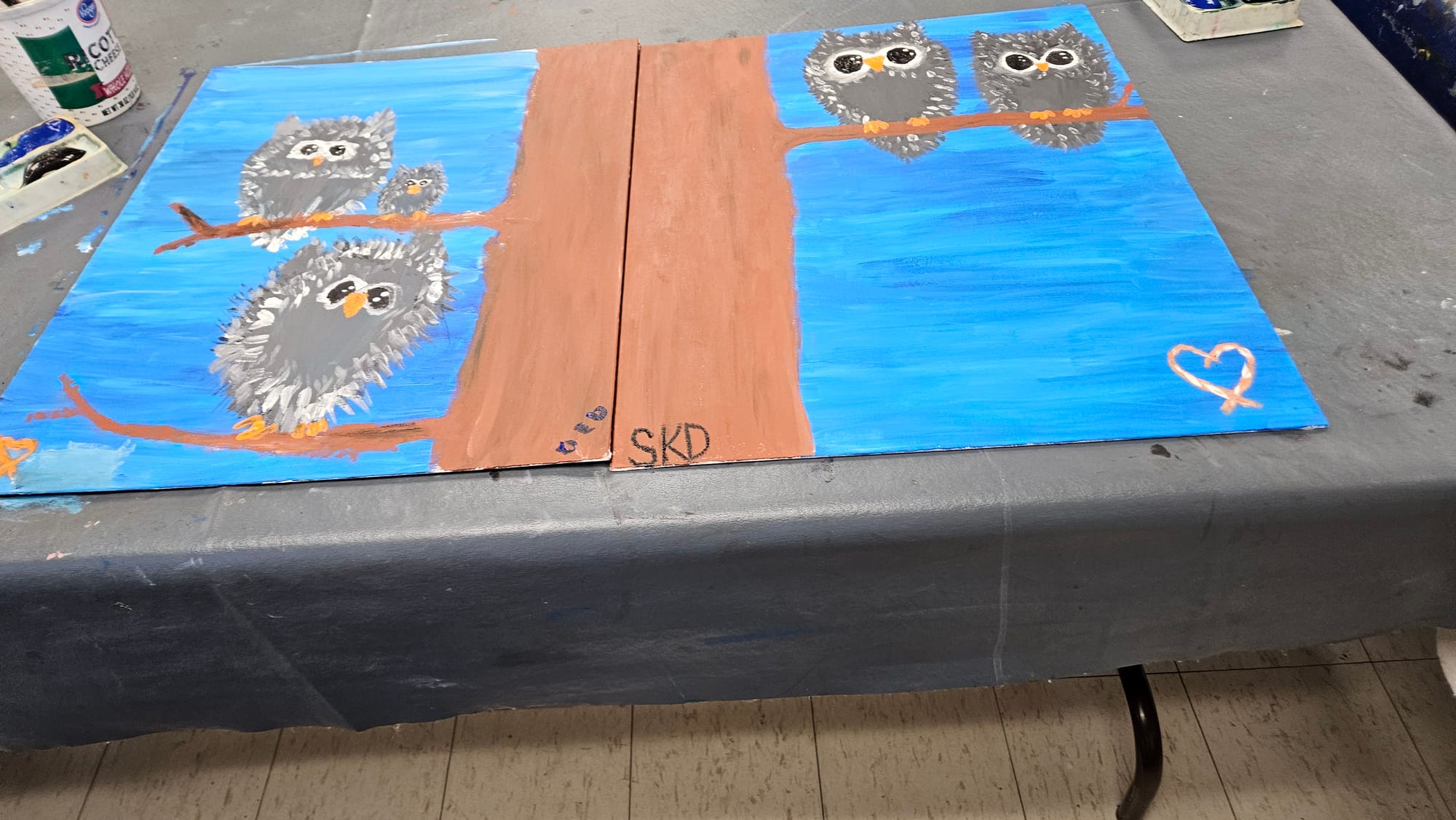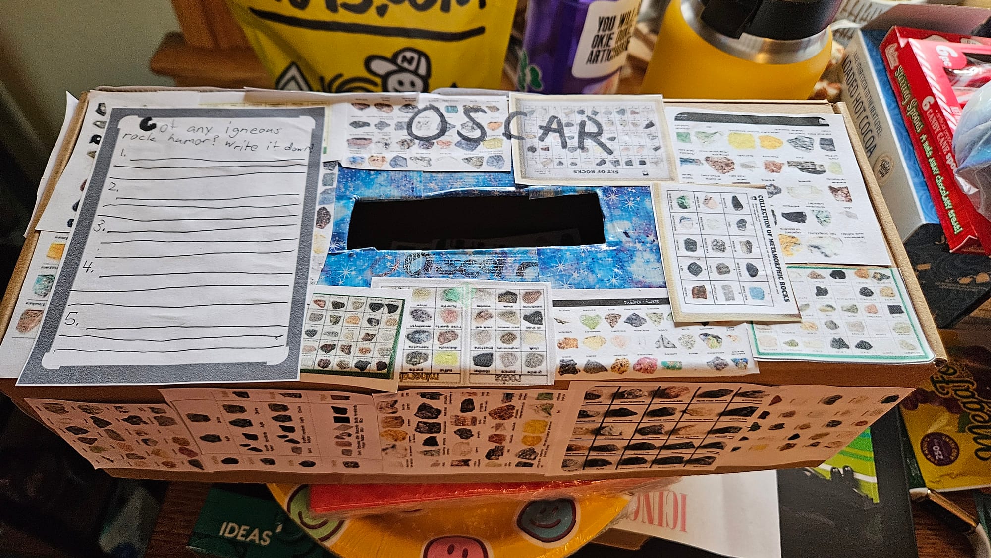 Clockwise from top left: Oscar and a pal playing a virtual reality game; Oscar's Valentine's Day box--note the space to write down rock jokes; pre-movie at the CSP Pops; and our owls, representing Papa, Romie, Dad, Mom, and Oscar.