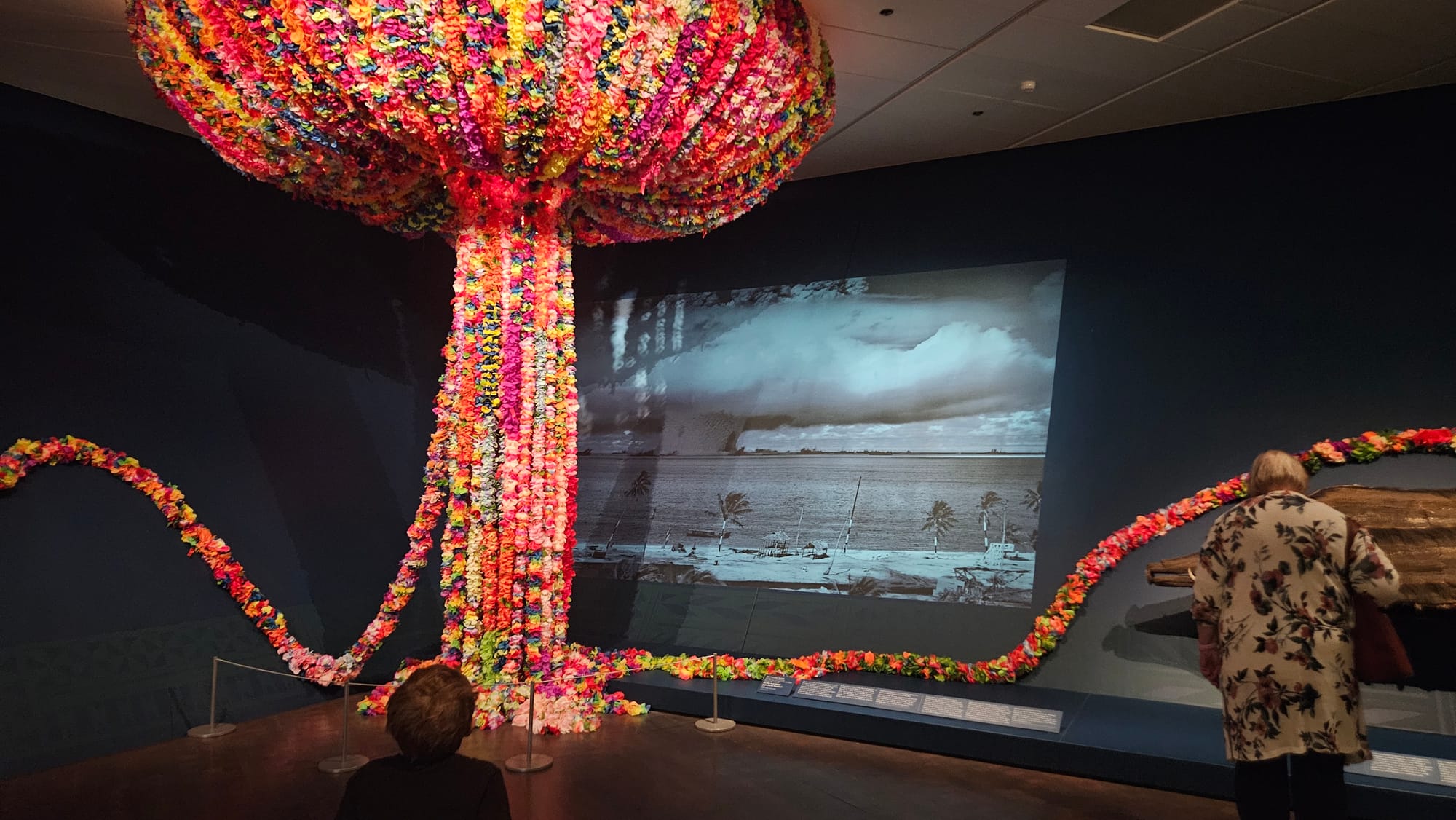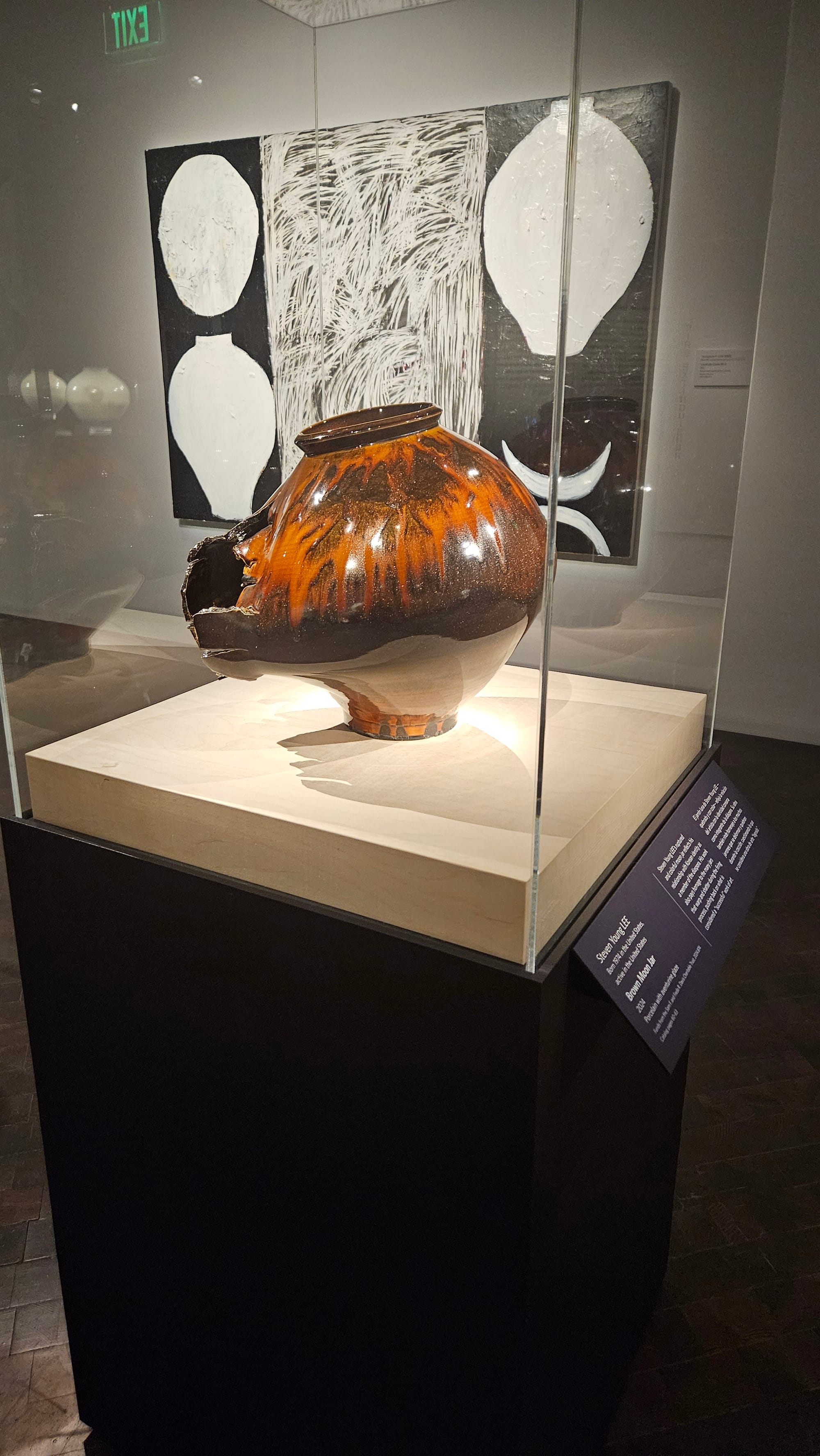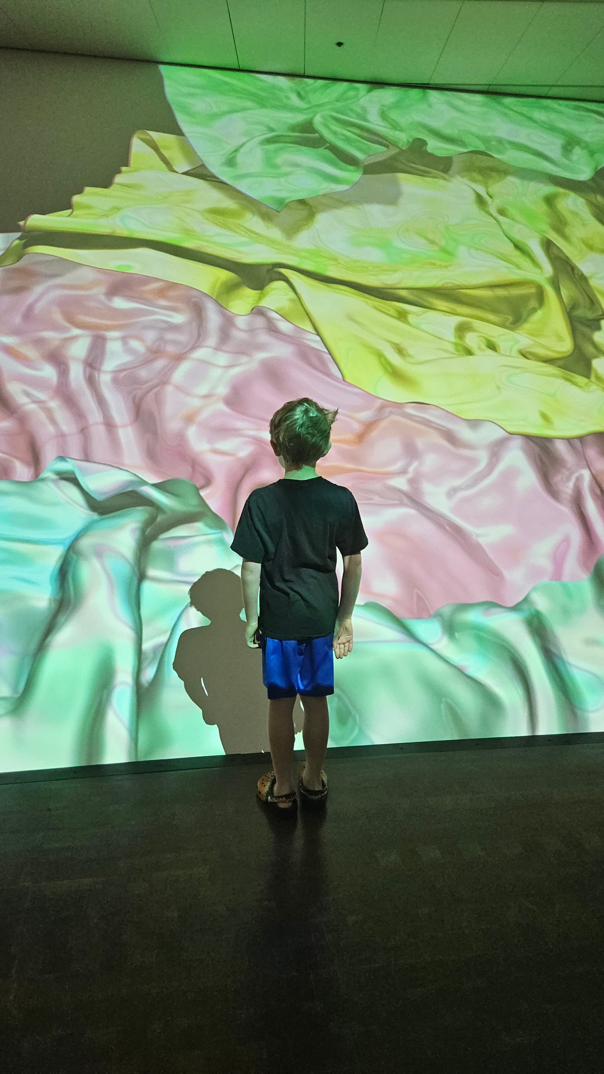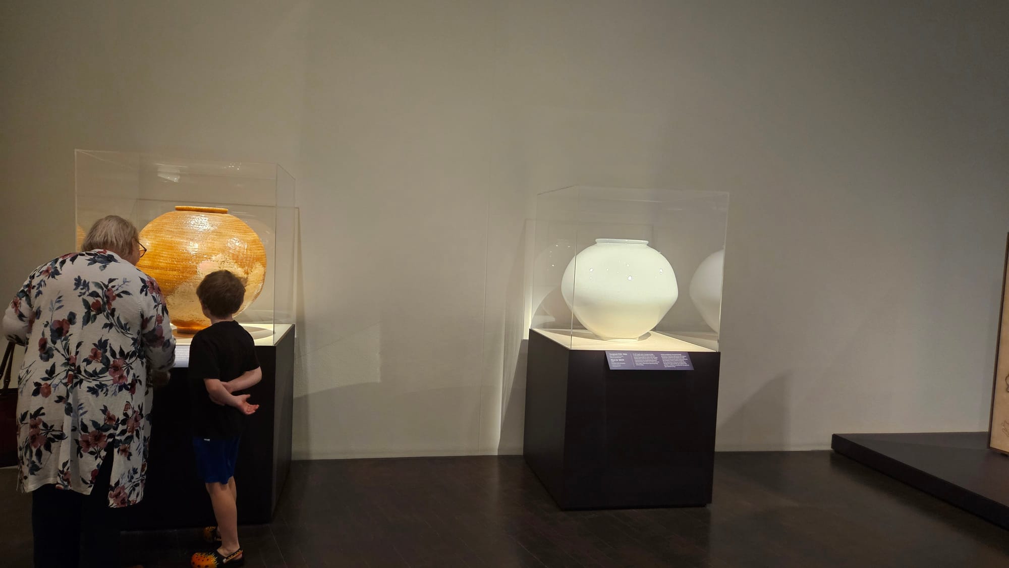 From top left: Oscar enjoying the more interactive aspects of the museum; some incredible Korean moon jars; a recent moon jar with a hole; a hypnotizing video installment; an incredible exhibit on the art of Oceania, with this piece serving as a commentary on the nuclear testing done in that part of the world.