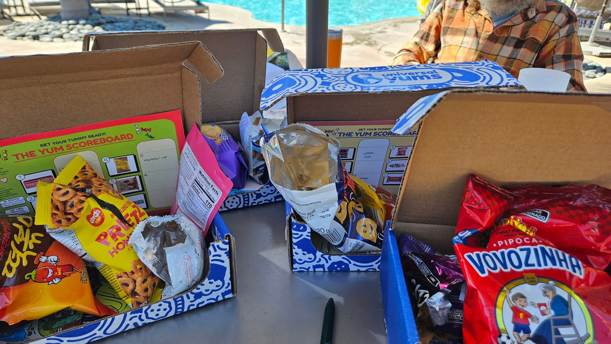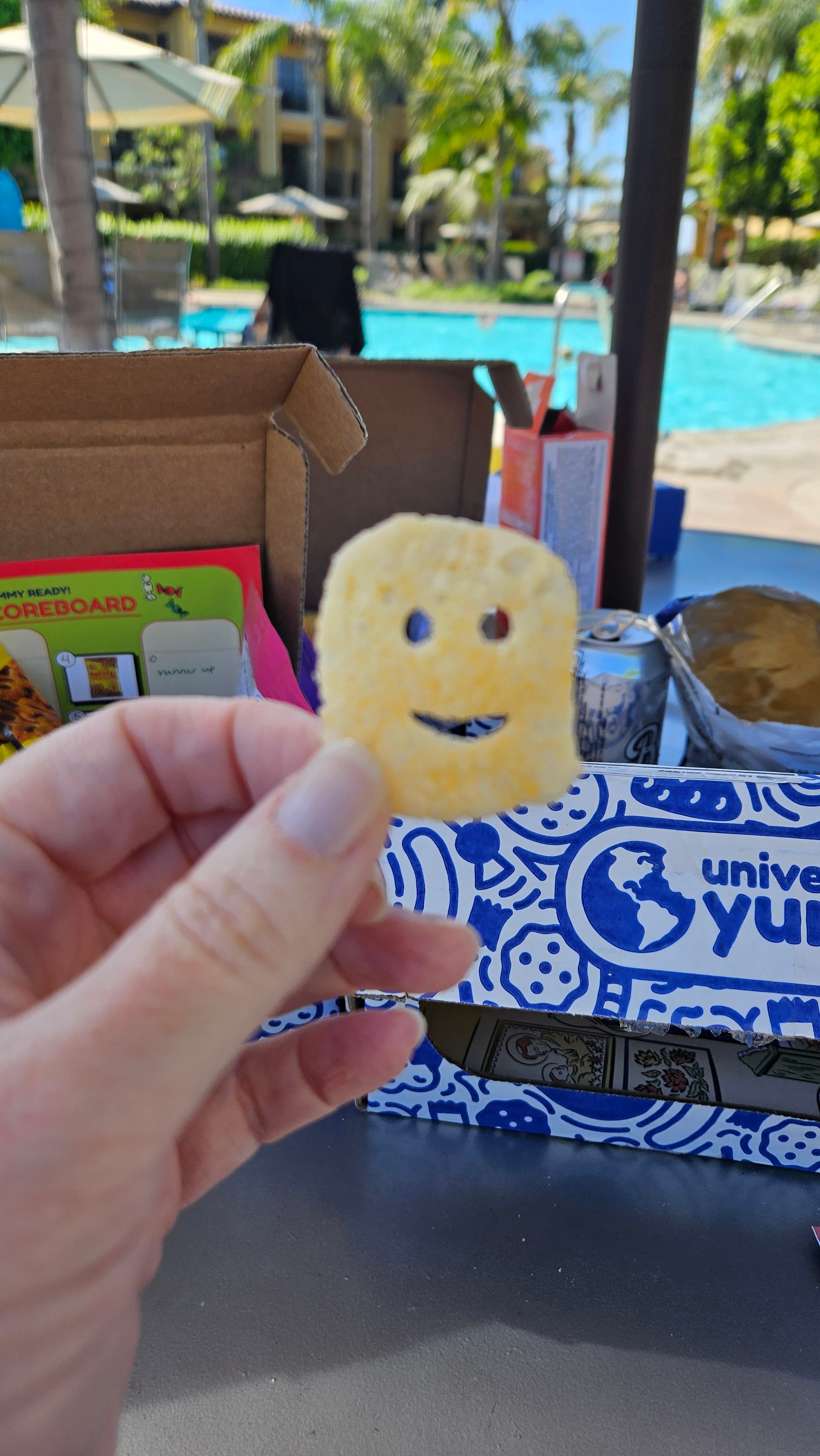 After all that activity and before the long drive home, we decided to stay closer to the resort for our last day. Oscar finally got to go down the pool slide, which had been closed every other time he visited, and to make up for lost time, he slid about a hundred times. Instead of lunch, we snacked on the four Universal Yums boxes we brought with us (this was a Christmas present for Jeremy that we kept meaning to get around to). We rated our favorite snacks from Greece, Korea, Brazil, and Poland, some of which were extremely delicious and none of which outright sucked. The champion was a bag of Korean peach gummies. That night, we ate by the ocean and put our feet in the water as the sun went down. Then we got back to the resort to discover there was a citywide power outage, which meant packing up in the dark (and of course the lights came back on just as we were finishing).