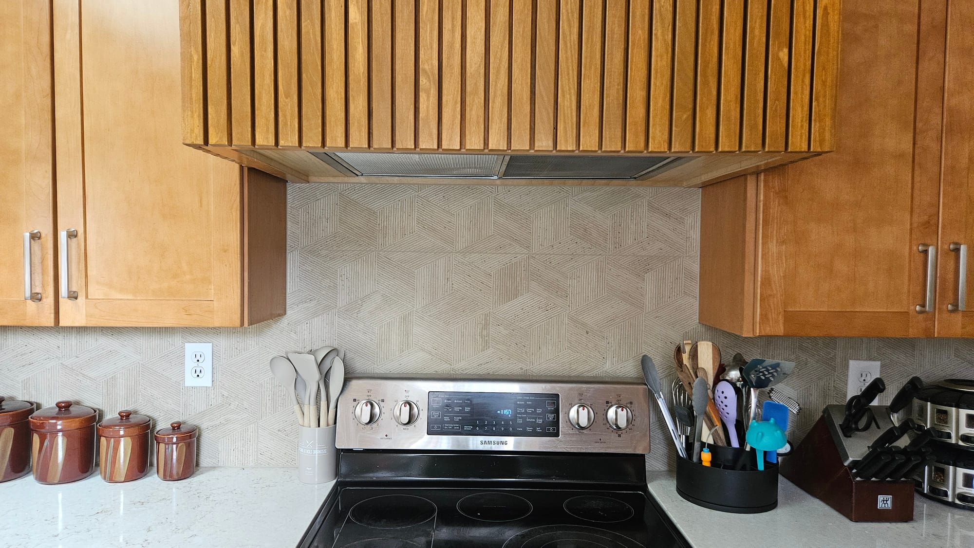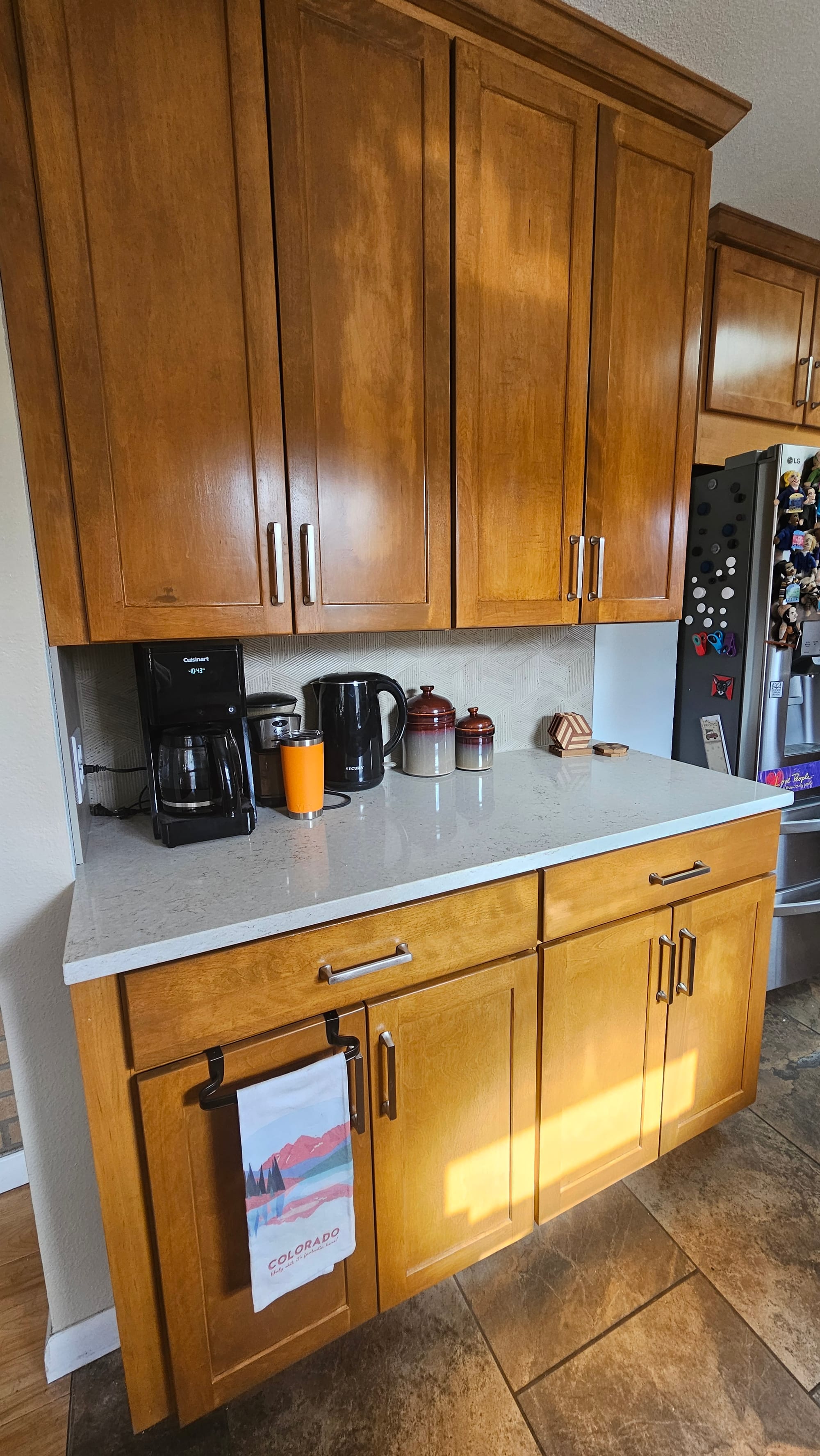 A couple of "after" shots of the kitchen. Left: One of the new lines of cabinets we added to give ourselves more usable space (in this case, a beverage station). Right: A glimpse of the hood and the tumbling blocks tile. It's wild how much the stain color changes with the light, by the way, which turned out to be a major frustration as the old stain was not longer available and the contractor had to mix up something to match.