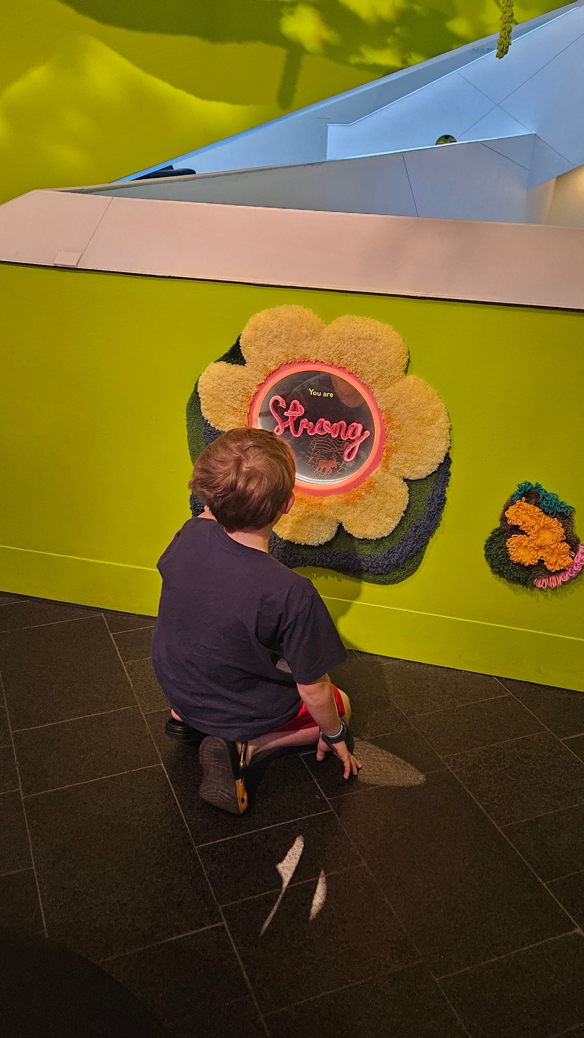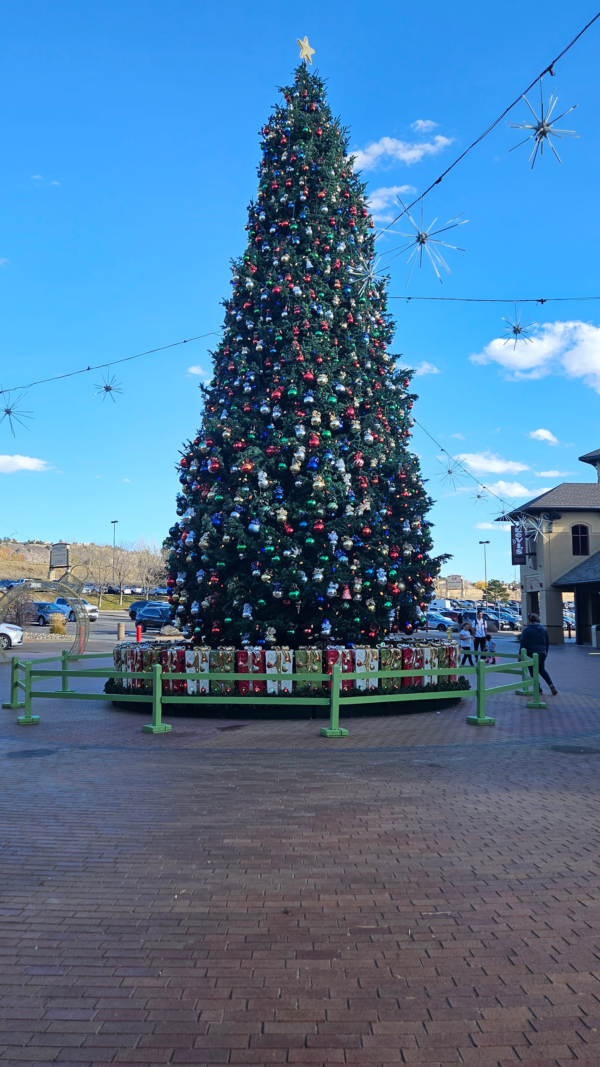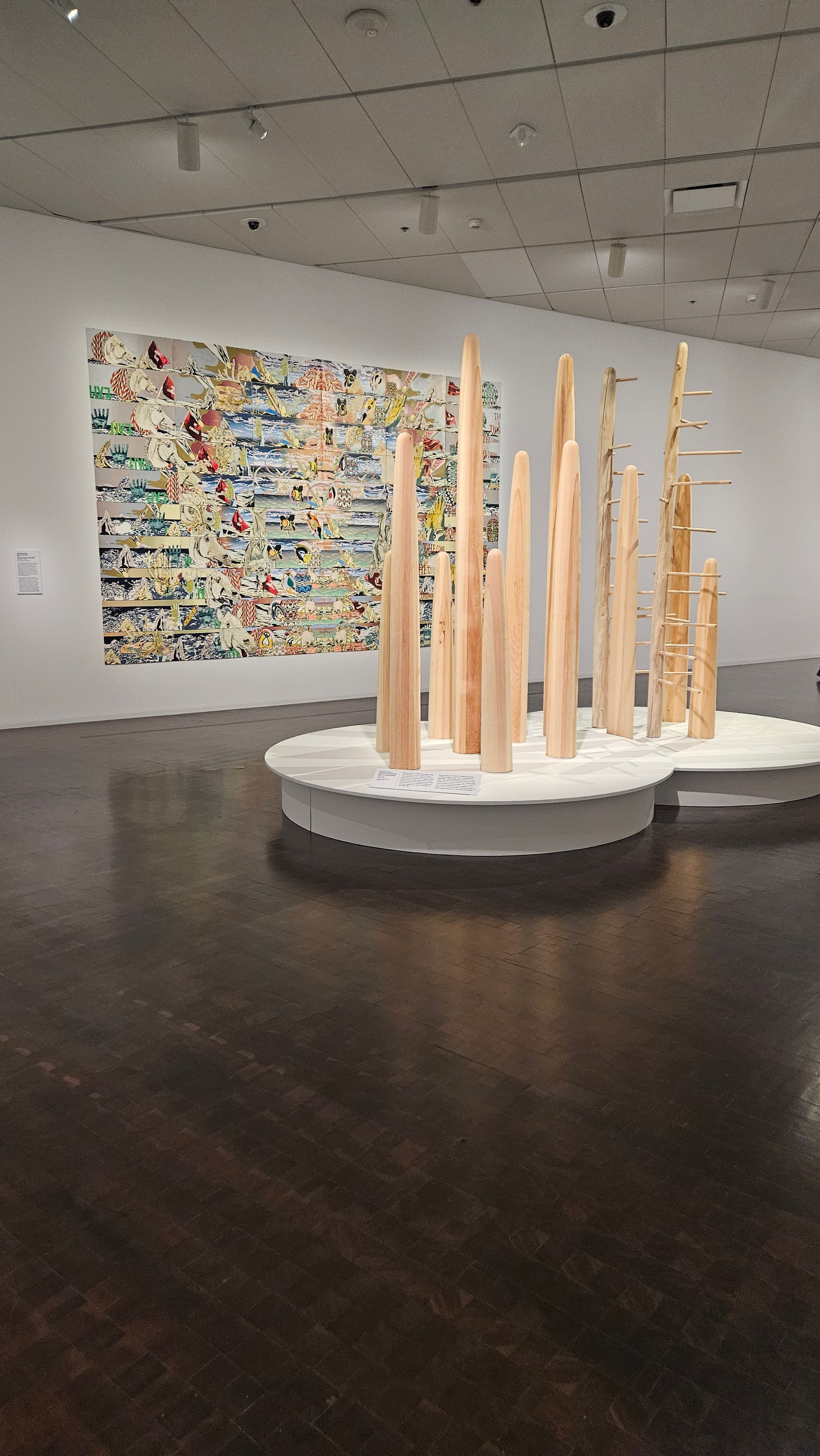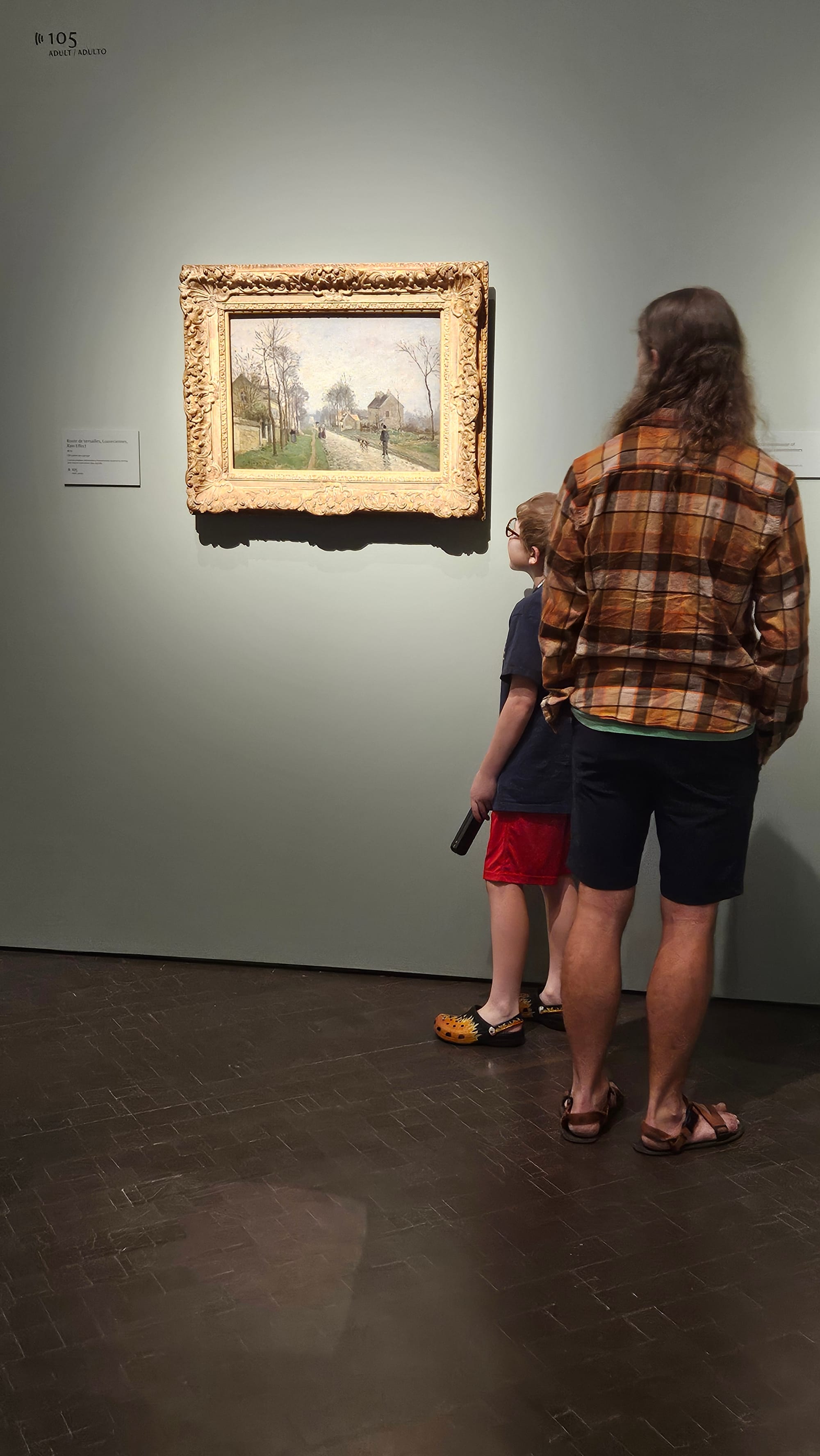 Top, left to right: Jeremy showing Oscar the texture of Pissarro's oil paintings (they got asked to TAKE A STEP BACK PLEASE a few times); one of my favorite paintings in the exhibit; Oscar checking out the Sadie Young exhibit. Bottom: A few pieces from Andrea Carlson's Constant Sky exhibit; the enormous Christmas tree at the outlet malls, which had been lit the night before we stopped in.