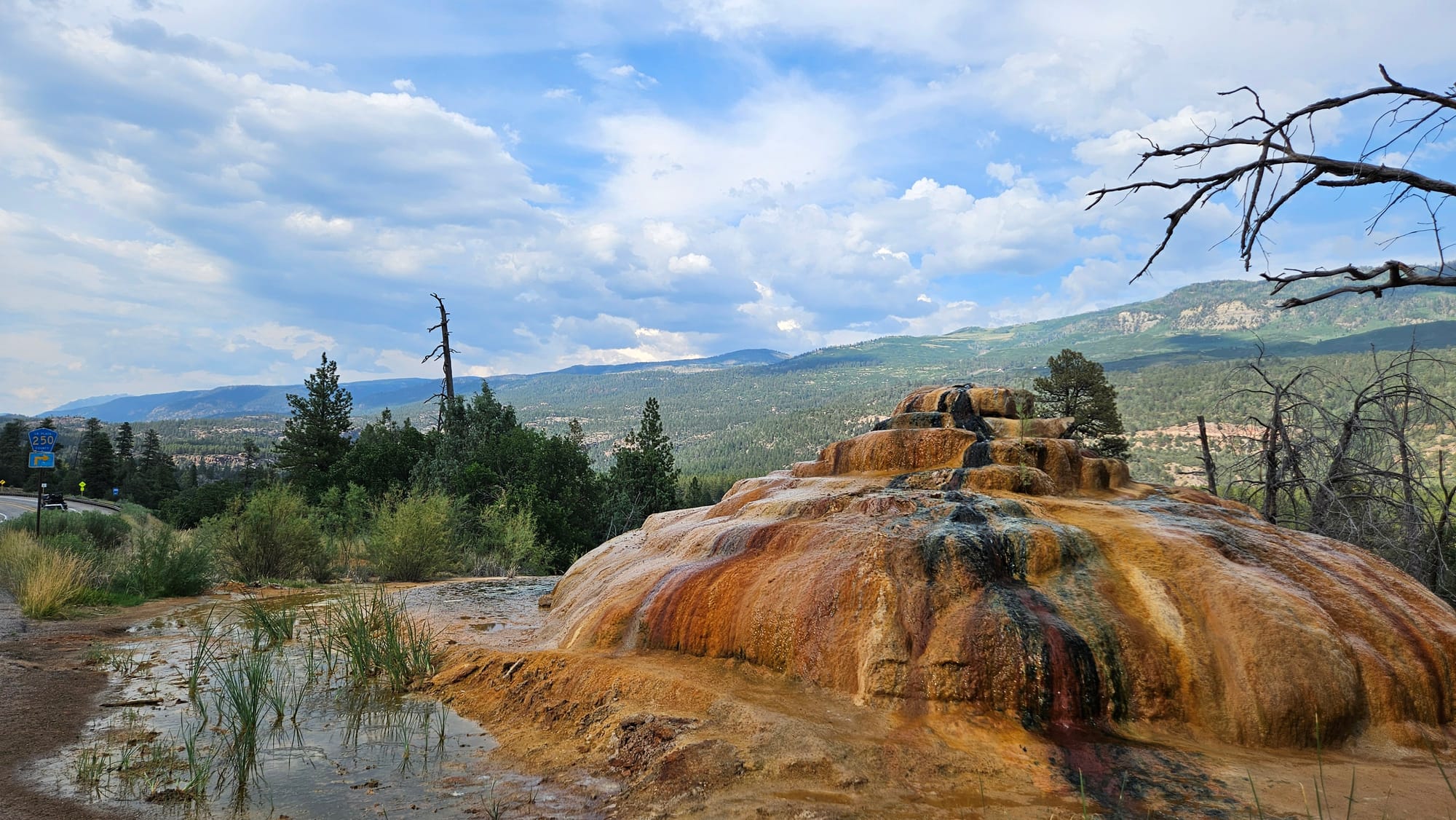 Our first stops were Durango and Mesa Verde. Jeremy and I had been to Durango before, so we had a sense of what to expect there, but we found a new fun thing to visit with Oscar: the Pinkerton Hot Springs, which are literally right on the side of the road and look kind of like a giant cinnamon roll. We didn't get into the little pool that collects the water, but it was still a fun little stop.