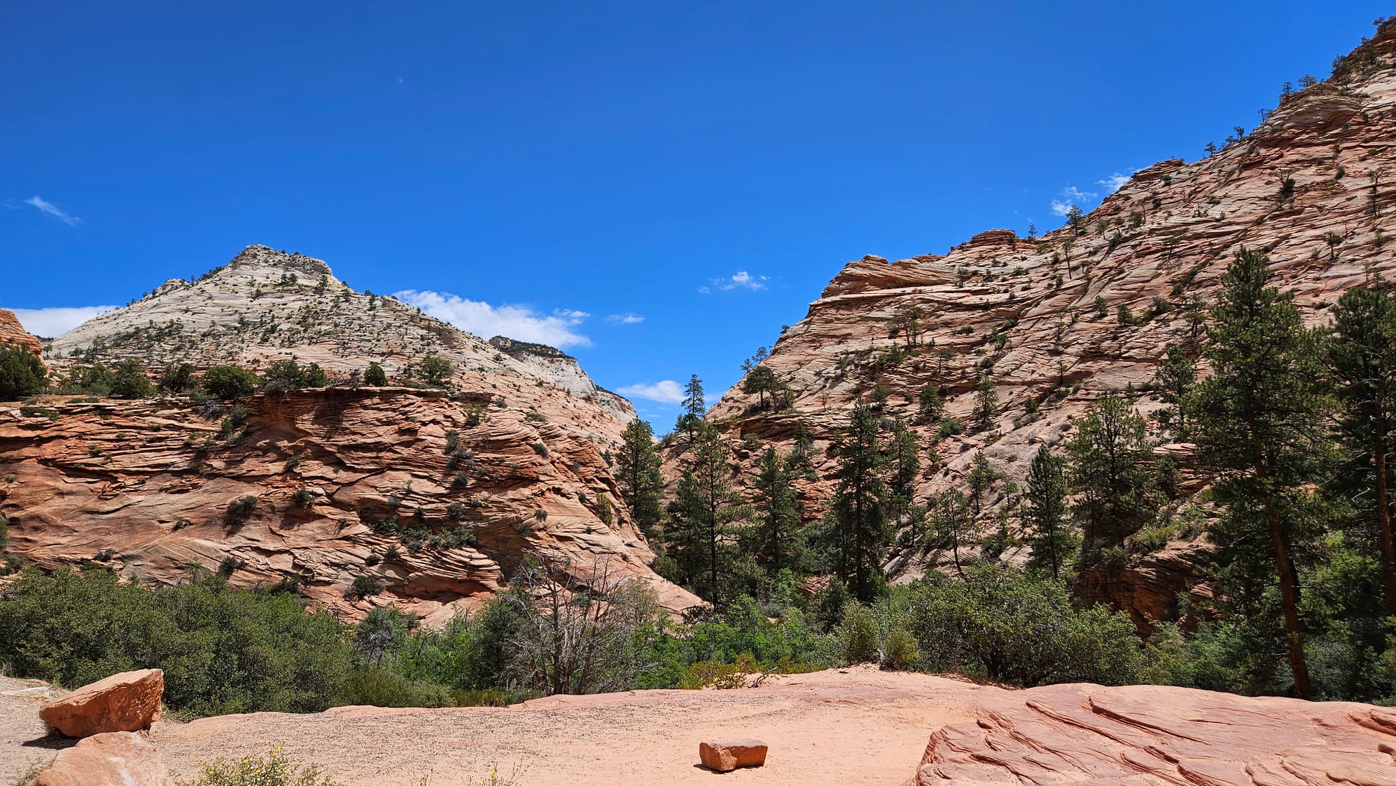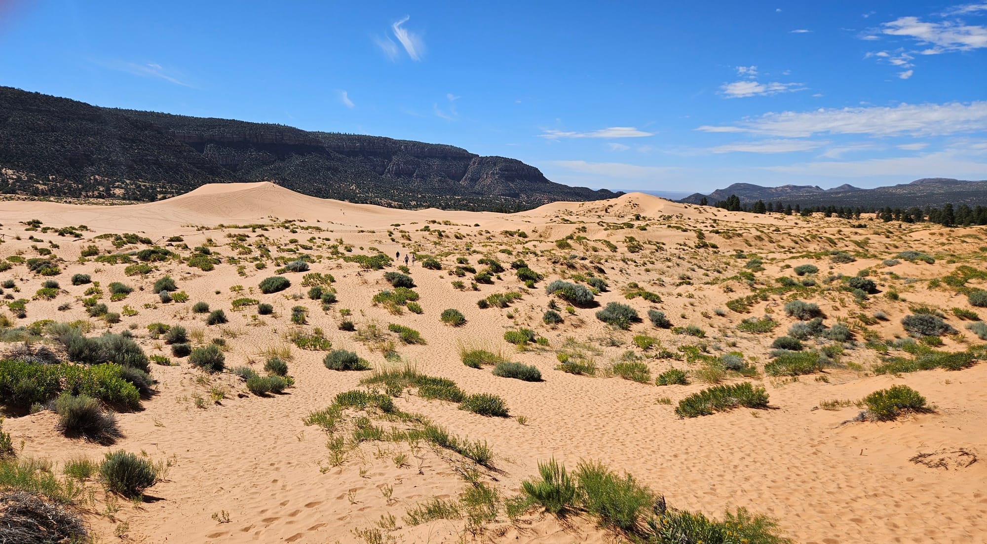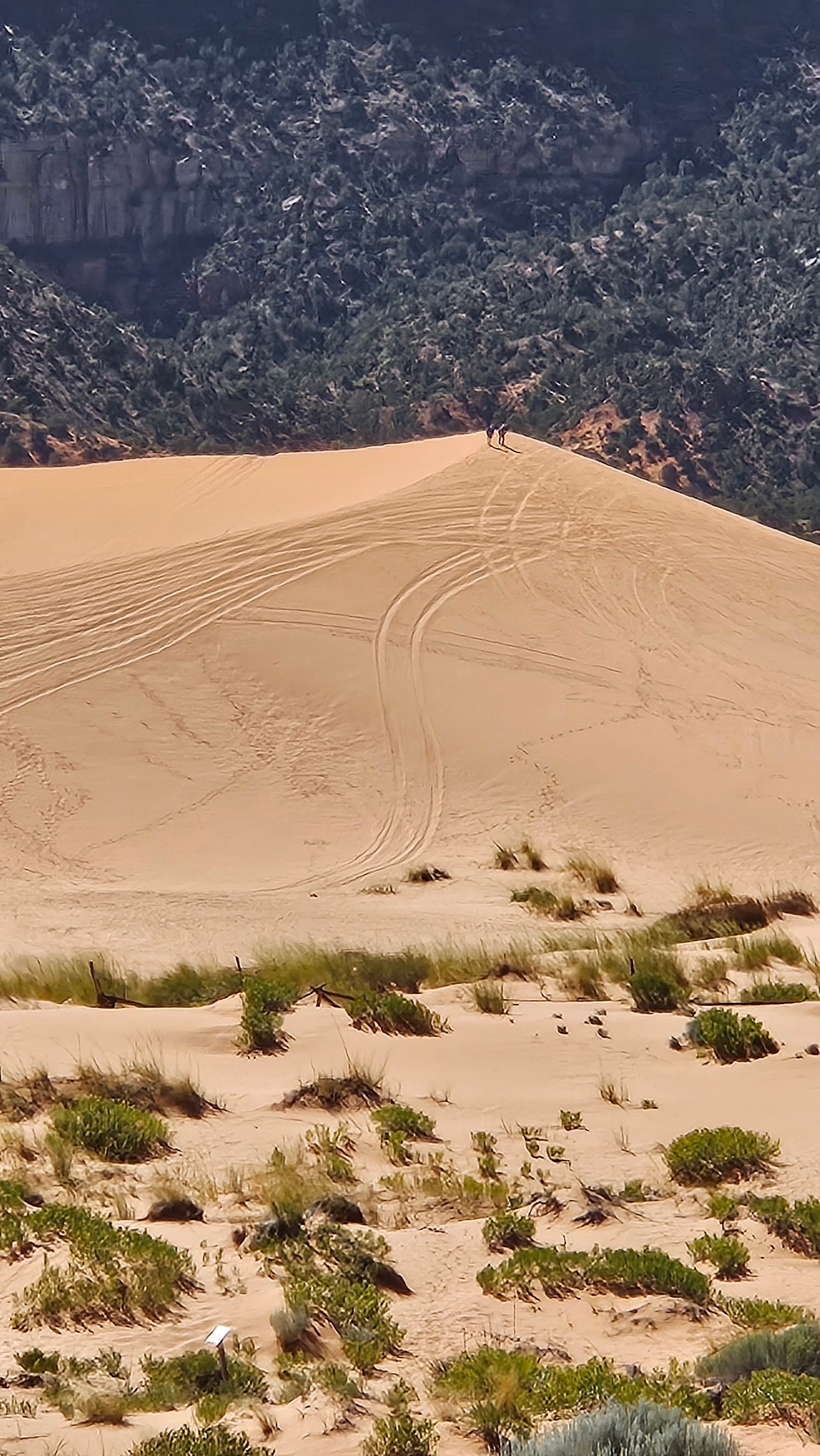 Luckily, the smoke didn't follow us to our next stops– the Coral Pink Sand Dunes outside of Kanab, Utah, and Zion National Park, the busiest stop on our trip. The sand dunes made for a lovely short stop; the color doesn't look as vivid in pictures as it does in person. Oscar got very lucky when a family who had rented a sand sled let him borrow it for a slide down the hill.